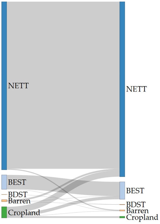 Projected land cover changes from 2015 to 2100 under Shared Socioeconomic Pathway 5 in the study area. Bars show the area occupied by each land cover type in 2015 (left) and 2100 (right). Flows illustrate the expected transition paths between these periods. Acronyms: BDST (broadleaf deciduous temperate shrubs), BEST (broadleaf evergreen temperate shrubs), NETT (needleleaf evergreen trees; conifers).
