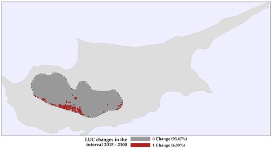 The anticipated number of land use and land cover changes (LUC) in the study area between 2015 and 2100 under the Shared Socioeconomic Pathway 5. The black dashed line consistently outlines the IUCN-defined potential distribution area of Quercus alnifolia.