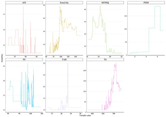 Response curves of temporally dynamic bioclimatic and soil variables. This figure presents the response curves for key bioclimatic and soil variables affecting Quercus alnifolia, as analysed in our study. Variables include AIT (Thornthwaite’s Aridity Index), MTWQ (Minimum Temperature of the Warmest Quarter), PDM (Precipitation of the Driest Month), PS (Precipitation Seasonality), TAR (Temperature Annual Range), and TS (Temperature Seasonality). Suitability scores for Quercus alnifolia are quantified on a scale from 0 to 1000, indicating the range of habitat suitability.