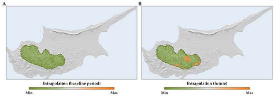 In the study area, we did not detect univariate extrapolation (i.e., extrapolation outside the range of training conditions). However, we observed combinatorial extrapolation (i.e., extrapolation within the range of training conditions), predominantly in the eastern and southern parts of the species’ range (Figure 5). Consequently, we assigned suitability values of 0 to those areas. Regarding the Shape extrapolation threshold, after evaluating seven different thresholds ranging from 50 to 300 in increments of 50, we selected a threshold of 100. This decision was informed by the relatively broad distribution of Quercus alnifolia within the Troodos mountain range, notwithstanding its status as a single-island endemic.