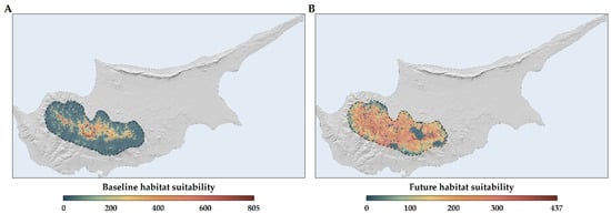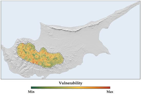 When mapping the spatial distribution of vulnerability, our analysis concentrated on the HadGEM2 RCP 8.5 scenario for the 2070s, which was identified as the most severe scenario in terms of vulnerability. Regions of heightened vulnerability were primarily located on Mt. Troodos and along the western edge of the species’ distribution range (Figure 10).