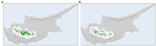 Quercus alnifolia is predominantly found in the principal Troodos mountain range, with the central part of its distribution located in Mt. Troodos National Park (Figure 6A and Figure 7A). Future projections suggest a more fragmented and diminished distribution for the species (Figure 6B and Figure 7B).