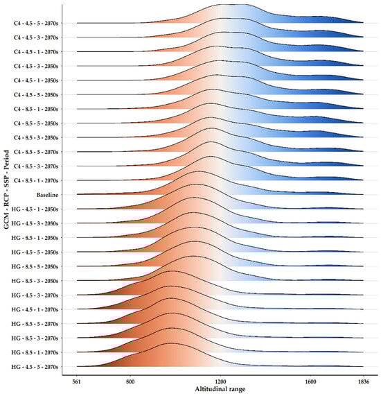 Altitudinal distribution of Quercus alnifolia across GCMs, RCPs, SSPs, and periods. This ridge plot illustrates the range of altitudes at which Quercus alnifolia occurs, as projected by various Global Circulation Models (GCMs), under different climate scenarios [Representative Concentration Pathways, RCPs (4.5 and 8.5), and Shared Socioeconomic Pathways, SSPs (1, 3, and 5)] across all periods analysed. Acronyms used: C4: CCSM4; HG: HadGEM2.