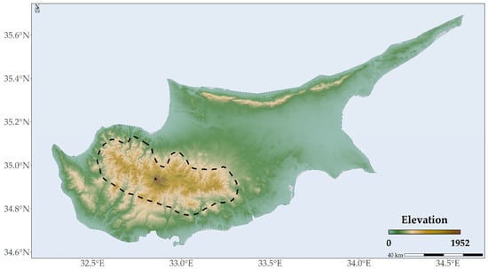 Topographical map of Cyprus. The potential distribution area of Quercus alnifolia, as defined by the IUCN, is demarcated by a black dashed line. A black triangle marks the highest peak of Mt. Troodos.