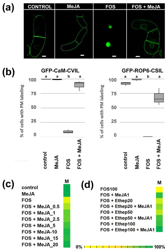 Jasmonic acid methyl esther (MeJA) restores inhibition of GFP-CaaL protein prenylation by fosmidomycin (FOS). (a) Confocal pictures of control, fosmidomycin/FOS (100 μM) and FOS/MeJA (100 μM/20 μM) cells expressing GFP-CaM-CVIL under the control of the dexamethasone-inducible promoter. Seven-day-old cells (stationary phase) were diluted 5 times in new MS medium and cultivated for 3 h in the presence of inhibitors before induction with 30 μM dexamethasone. (b) Cells expressing GFP-CaM-CVIL have been categorized into 2 classes: cells without a nucleus localization and cells in which nuclei are labelled. Three independent sets of experiments were performed, in which at least 300 localizations were evaluated. A Box and Whisker plot was used to illustrate the results. Groups with different letters have significantly different means (p ≤ 0.005) as calculated by a Bonferroni–Holm test following a one-way ANOVA. (c) Heat maps showing the dose-dependent effect of MeJA and the additive effect of ethephon (d). The color scale from yellow (0%) to green (100%) indicates the percentage of cells with membrane localization. The more the color is green, the better membrane localization is effective. Cells with membrane localizations (M) were counted (n > 300).