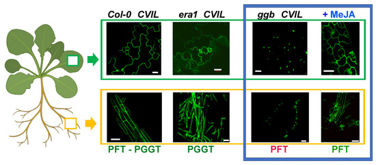 Representative confocal pictures depicting subcellular localization of GFP-CaM-CVIL proteins expressed in Arabidopsis lines and activation of protein prenylation by MeJA in ggb lines. Col-0, era1, and ggb lines have been transformed with pTA-GFP-CaM-CVIL constructs (CVIL), and leaves (green scare) or roots (yellow scare) have been observed by confocal microscopy. The WT Arabidopsis background retains both PFT and PGGT activities, while in loss of function era1 lines, only PGGT-I is expressed, and in ggb lines, only PFT remains active. In ggb CVIL lines, the protein cannot be modified, indicating that PFT alone cannot modify GFP-CaM-CVIL under standard growth conditions (red letters, left side in the blue rectangle). In the presence of MeJA (in blue), the membrane localization of the GFP-modified protein is again observed in ggb plants, suggesting an active PFT (green letters (right side in the blue rectangle). The white bar corresponds to 50 μm. On the left, the Arabidopsis plantlet has been created using biorender (https://www.biorender.com/ (accessed on 15 October 2023)).