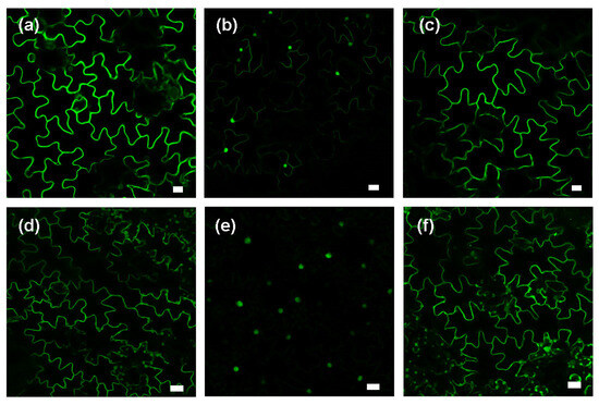 Like tobacco BY-2 cells or Arabidopsis leaves and roots, untreated tobacco epidermal cells show plasma membrane labelling (Figure 3a,d). In this experiment, we opted to block both the MVA and MEP pathways simultaneously in order to prevent the biosynthesis of isoprenoid precursors. Thus, we determined minimal concentrations of fosmidomycin (FOS/blocking the MEP pathway) and mevinolin (MV/blocking the MVA pathway), leading to the delocalization of GFP-CaM-CVIL into the nucleus (Supplementary Materials Figure S3). By evaluating the nuclear localization in FOS and MV-combined treatments, we selected mevinolin (5 μM) and fosmidomycin (100 μM) as reference concentrations (FOS100/MV5) that were sufficient to block protein prenylation in leaf disks. It has to be noted here that without inhibition of the MVA pathway, at 300 μM, fosmidomycin delocalizes the protein into the nucleus, while mevinolin, even at very high concentrations, cannot. To test whether stress promotes prenylation efficiency in tobacco leaf disks, cellulase and MeJA treatments were used to assess membrane localization in the presence of FOS100/MV5 (Figure 3b,e). Membrane localization is restored when inhibition of prenylation is combined with cellulase treatments (Figure 3c). and with MeJA treatments (Figure 3f).