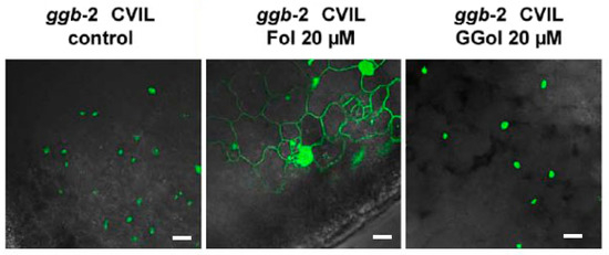 To support our assertions, we subsequently examined the impact of another compound that is known to stimulate HMGR activity by acting as an elicitor. As mentioned earlier, Fol has been described as a chemical stimulating HMGR in tobacco BY-2 cells, both at a transcriptional and translational level [37]. This results in a rise in MVA levels, the enzyme product. At the same time, Fol is a substrate of specific kinases catalyzing the formation of FPP in the realm of the FPP salvage pathway [30]. In addition, Fol can overcome inhibition by fosmidomycin in tobacco BY-2 cells, but not when cells are inhibited with fosmidomycin and mevinolin simultaneously [38]. It was concluded that the MVA pathway is involved in protein modification under those conditions. On this basis, we tested the ability of Fol to induce membrane localization of GFP-CaM-CVIL expressed in Arabidopsis ggb lines, where only PFT is active (Figure 4). At 20 μM, Fol partially restores membrane localization of GFP-CaM-CVIL in the Arabidopsis ggb background. On the contrary, in geranylgeraniol (GGol, 20 μM)-treated seedlings, the labeling remains in the nuclei (Figure 4).