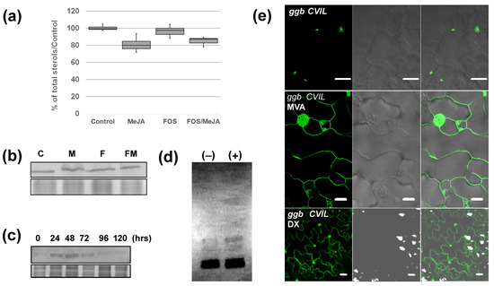 This implies that in the presence of Fol, PFT, which is the only type-I active enzyme in an Arabidopsis ggb background, recognizes GFP-CaM-CVIL as a protein substrate. It has been proposed that Fol is not directly used as a substrate but induces the production of MVA by activating HMGR [37,38]. To explore the potential role of MVA in modifying PFT properties under stress conditions, we examined whether MVA production had been promoted under our experimental conditions. We therefore quantified phytosterols, the main MVA-derived metabolites produced in tobacco cells [44]. Cells were treated as described in Figure 1b, and a total sterol fraction (saponified fraction) has been isolated and quantified by GC-FID (Figure 5a). Surprisingly, no significant increase in sterol production could be observed. De facto, a slight drop in sterol levels is observed in the presence of MeJA. To understand this incoherent pattern, we quantified the HMGR levels expressed in these cells. HMGR protein quantification was realized by Western Blotting using microsomal fractions isolated from cells grown as described in Figure 1b and an antibody raised against the catalytical domain of Nt-HMGR2 [39]. Again, in 24 hour-old cells, regardless of treatment, the level of HMGR was not significantly different (Figure 5b). We surmised that levels of HMGR are already high and tested whether subculturing one-week-old cells into new MS-medium could possibly induce HMGR production and mask the likely effects of MeJA (Figure 5c). Interestingly, HMGR levels are high after 24 h and gradually decrease over time, consistent with the quantification of enzyme activity realized previously [27]. Results described in Figure 1a–c suggest that MeJA does not stimulate the accumulation of HMGR protein in tobacco BY-2 cells and does not promote an MVA-derived accumulation of phytosterols. That would mean that the signal we are trying to identify could be independent of HMGR protein accumulation.