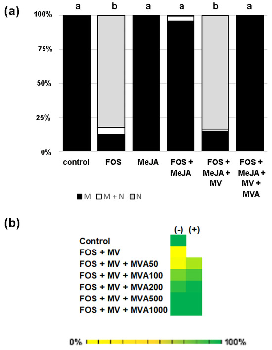 Mevalonic acid (MVA) as a candidate for providing prenyl groups in MeJA/FOS-treated tobacco BY-2 cells. In each experiment, cells were pretreated for 3 h with chemicals as indicated, before protein expression was induced with dexamethasone (15 μM). (a) Mevinolin (MV 10 μM) inhibits MeJA (20 μM)-mediated reversion of FOS (100 μM). Treated with FOS + MeJA + MV, the nuclear localization of GFP-CaM-CVIL expressed in tobacco BY-2 cells is revived. MVA (2 mM) reverses MV-induced inhibition of protein prenylation in the presence of FOS and MeJA. Distribution of GFP fluorescence in membrane (M, black) membrane/nucleus (M + N, white) and nucleus (N gray) is indicated in percentage and chi-squared tests against the null hypothesis being true were used to assign significant differences to p-values < 0.01, which are indicated by different letters. (b) Synergetic effect of increasing concentrations of MVA with (+) or without (−) MeJA (20 μM) in FOS/MV (100 μM/5 μM)-treated tobacco BY-2 cells. Cells with membrane localizations (M) were counted (n > 300). Color scale from yellow (0%) to green (100%) indicates the percentage of cells with membrane localization. The more the color is green, the better membrane localization is effective.