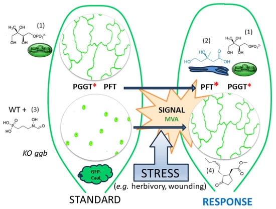The stress-induced signal might be correlated with an increase in the amount of MVA or an MVA-derived metabolite. It is anticipated that under stress conditions, PPTs will become less stringent toward dedicated protein substrates, which would increase their capacity to modify proteins needed in signaling pathways supporting stress responses. Abiotic stresses related to bites or wounding induce some signals that could potentially lead to MeJA production that will modify PFT substrate specificity. As a result, both PFT and PGGT are modifying the same protein, causing an increase in the prenylation capacity and potentially in the way the protein is modified (FPP vs. GGPP).