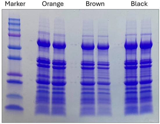 SDS PAGE (with β-mercaptoethanol, βME) comparison of the defatted extracts of pooled, pod-blasted samples that were separated into mesocarp colors (orange, brown, and black) and analyzed in duplicate. BIO-RAD™ Coomassie G-250 Stain (BIO-RAD™ Life Sciences, Hercules, CA, USA) and Any kD™ Mini-PROTEAN® TGX™ with Precision Plus Dual Color Standard. Lane one shows the BIO-RAD ™ Precision Plus Protein™ Dual Color Standard ranging from 10–250 kD.
