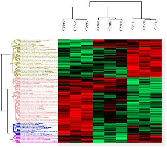 Data were queried against the database using MaxQuant v. 1.6.0.13: Peanuts_Genemodel_17NOV2015 concatenated with common contaminants [36]. In short, a 10 ppm or 20 ppm mass accuracy was used for the precursor mass accuracy and 20 mDa for fragment ions. The carbamidomethylation of cysteines was set as a fixed modification and oxidation of methionine, and the protein N-termini acetylation was set as variable modifications. Search results were filtered using false discovery rates of 2% or better for peptides and 1% or better for proteins. Label Free Quantitation (LFQ) [37] was used to relate to the quantified matched proteins. Utilizing the Perseus software platform (v. 1.6.15.0), the LFQ values were log 2-transformed and filtered for common contaminants. The data were further filtered by requiring signals in at least two out of three replicates for at least one of the conditions, thereby resulting in 1047 proteins being quantitated. Missing values were imputed. Comparisons of the BLK vs. ORG, BRN vs. ORG, and BRN vs. BLK groups were conducted by two-sample t-tests (FDR-based, 0.05), as well as multiple sample ANOVA tests (FDR-based). The results of the tests were visualized using heat maps and volcano plots.