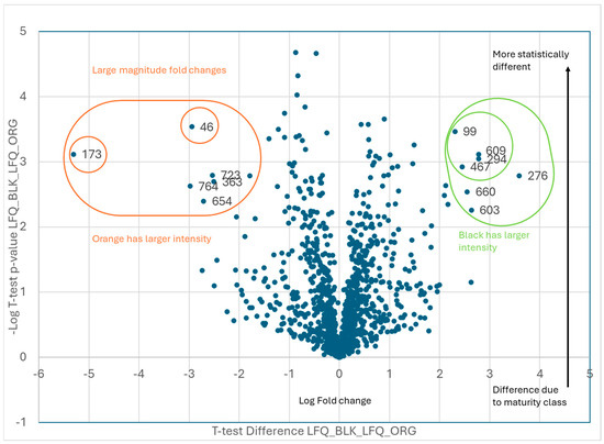 A volcano plot comparison of the two maturity classes: orange and black pod-blasted samples. The statistically significant proteins were identified in the peanut kernels. The ±2 Log2FC in the LFQ abundance of proteins was used as a threshold for assessing the magnitude changes, and a minimum t-test p-value of 0.05 was used as a threshold to evaluate statistical significance. n = 13 proteins were identified as significant, and the protein identity was preliminarily determined.