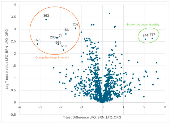 A volcano plot comparison of the two maturity classes: orange and brown pod-blasted samples. The statistically significant proteins were identified in the peanut kernels. The ±2 Log2FC in the LFQ abundance of proteins was used as a threshold for assessing magnitude changes, and a minimum t-test p-value of 0.05 was used as a threshold to evaluate statistical significance. n = 10 proteins were identified as significant, and the protein identity was preliminarily determined.