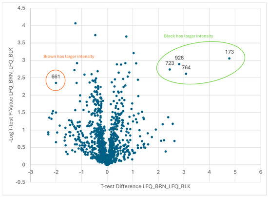 A −log10 plot of the p value obtained from the t-test vs. the log2 average intensity difference. Total proteins identified: n = 1047. Proteins of interest: brown vs. black maturity classes, n = 5.