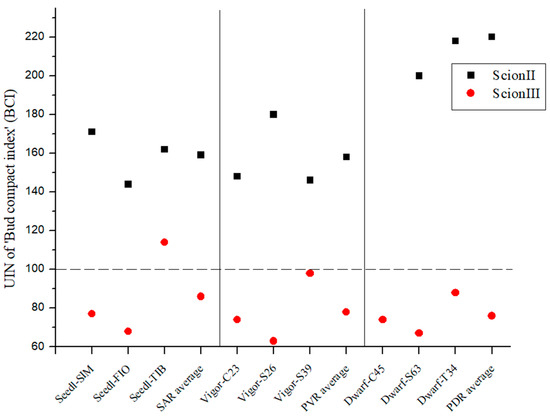 Bud compact index of two plant scion genotypes grafted on 9 different rootstocks expressed as UIN, where value of 100 represent control combination (non-grafted plants). SIM, S—population ‘Simba’, FIO—variety ‘Fiona’, TIB, T—variety ‘Tiborszallasi’, C—variety ‘Carmagnola’, Seedl, SAR—seedling-as-rootstock combination, Vigor, PVR—potentially vigorous rootstocks, Dwarf, PDR—potentially dwarfing rootstocks, ScionII—scion of chemotype II, and ScionIII—scion of chemotype III.