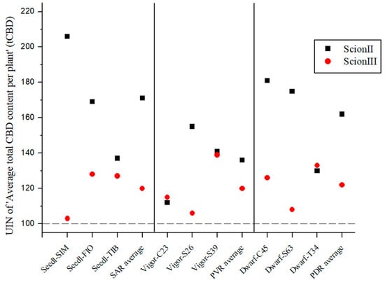 For the genotype ‘ScionII’, the results indicate that the rootstock significantly affects the CBD yield (CBDY) of the cannabis plants (Figure 6). The SAR combinations had an average UIN value of 184, which corresponds to an 84% increase in CBDY. The ‘Seedl-SIM/ScionII’ combination gave the highest UIN of 225, an increase of 125%. In the PVR combination group, the variety ‘Vigor-S26/ScionII’ showed the highest UIN value for CBDY. Within the PDR combinations the strongest effect on CBDY was observed in the ‘Dwarf-C45/ScionII’ and ‘Dwarf-S63/ScionII’ combinations. In comparison, the PDR combinations using ‘ScionIII’ as scion resulted in a considerable average UIN of 155, representing a 55% increase in CBDY. In particular, the ‘Dwarf-C45/ScionIII’ combination showed the highest increase of 86%. CBDY was also affected in the SAR and PVR groups.