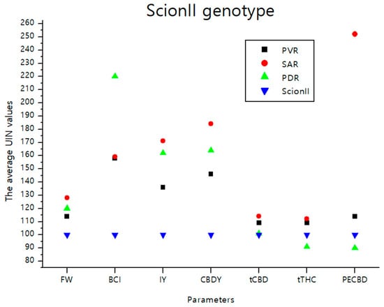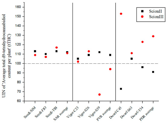 The results shown in Figure 4 also indicate that rootstock can strongly influence the UIN of total THC content (tTHC) in ‘ScionII’ and ‘ScionIII’ plants. For the ‘ScionII’ genotype, the results indicate a significant influence of rootstock on tTHC.