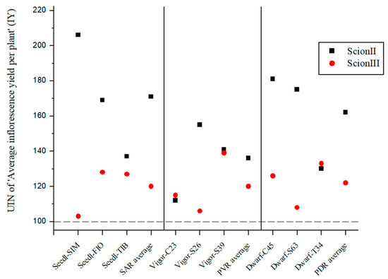 Average inflorescence yield per plant (IY) for two scion genotypes grafted on nine different rootstocks expressed as UIN, where value of 100 represent control combination (non-grafted plants). SIM, S—population ‘Simba’, FIO—variety ‘Fiona’, TIB, T—variety ‘Tiborszallasi’, C—variety ‘Carmagnola’, Seedl, SAR—seedling-as-rootstock combination, Vigor, PVR—potentially vigorous rootstocks, Dwarf, PDR—potentially dwarfing rootstocks, ScionII—scion of chemotype II, and ScionIII—scion of chemotype III.