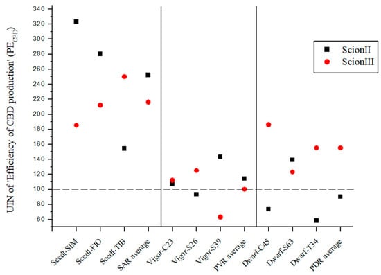 Efficiency of CBD production (PECBD) for two plant scion genotypes grafted on nine different rootstocks expressed as UIN, where value of 100 represent control combination (non-grafted plants). SIM, S—population ‘Simba’, FIO—variety ‘Fiona’, TIB, T—variety ‘Tiborszallasi’, C—variety ‘Carmagnola’, Seedl, SAR—seedling-as-rootstock combination, Vigor, PVR—potentially vigorous rootstocks, Dwarf, PDR—potentially dwarfing rootstocks, ScionII—scion of chemotype II, and ScionIII—scion of chemotype III.