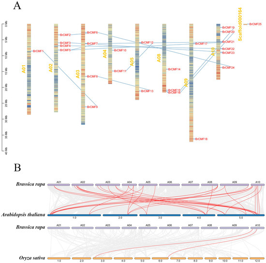 BrCMF genes were unevenly distributed across eight chromosomes of B. rapa. BrCMF25 was the only gene that was not mapped to one of the 10 chromosomes, and it was located on Scaffold000164, an unknown chromosome, and showed no collinearity with any other genes. The greatest number of BrCMF genes was located on Chromosome 10 (6), and the lowest number of BrCMF genes were located on Chromosome 1 (1). Chromosomes 2, 3, 4, 5, 8, and 9 contained four, four, two, two, three, and two BrCMF genes, respectively; no BrCMF genes were detected on Chromosomes 6 and 7 (Figure 1A).