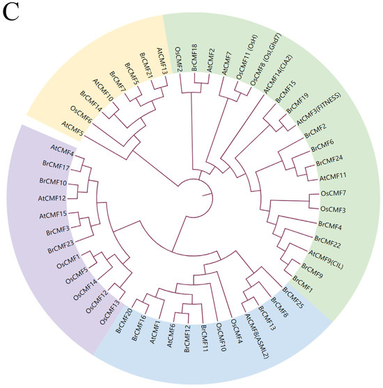 Phylogenetic trees of the complete amino acid sequences for BrCMFs, AtCMFs, and OsCMFs were constructed using the maximum likelihood method in MEGA X [50] with default parameters, while branch support was evaluated using 1000 bootstrap replicates. We used iTOL (https://itol.embl.de/ accessed on 27 November 2022) to make the phylogenetic tree.