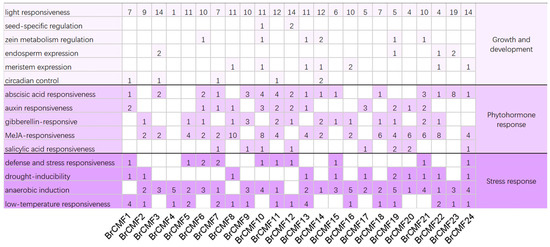 A total of 24 BrCMFs contain various cis-acting elements, and these cis-acting elements were classified into three groups based on their functions, including growth and development, phytohormone response, and stress response, as indicated on the right side of the figure. The functions of the cis-acting elements are shown on the left side, along with the number of cis-acting elements in each gene, while blank cells indicate the absence of the cis-acting element. Each column corresponds to a gene, which is indicated at the bottom, and each number indicates the number of cis-acting elements present in the 2000 bp 5’ region of the corresponding gene.