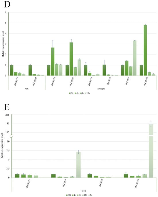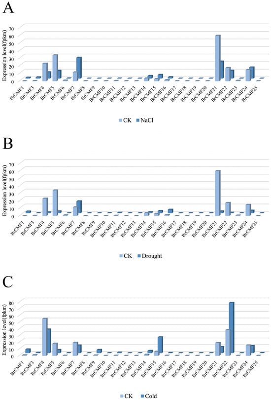 We compared the expression levels of 24 BrCMF genes under cold, drought, and salt stress using transcriptome data (Figure 5A–C, Table S2). The expression of most genes was low under salt, drought, and cold stress. For example, the expression levels of BrCMF8, BrCMF12, BrCMF13, BrCMF18, and BrCMF19 were always 0 under three stress conditions, corresponding to no height of the columns; however, significant changes were observed in the expression of some genes. Salt treatment decreased the expression of BrCMF5, BrCMF21, and BrCMF22 and increased the expression of BrCMF7 and BrCMF15. Following exposure to drought stress, the expression of several genes was significantly downregulated and the expression of BrCMF7 was upregulated, which suggests that BrCMF7 plays a special role in the response to drought stress. During cold treatment, the expression of BrCMF5, BrCMF7, and BrCMF21 was downregulated; however, the expression of BrCMF15 and BrCMF22 was upregulated. Changes in the expression of BrCMF5, BrCMF7, BrCMF15, BrCMF21, and BrCMF22 strongly suggest that they play an important role in the response to abiotic stress.