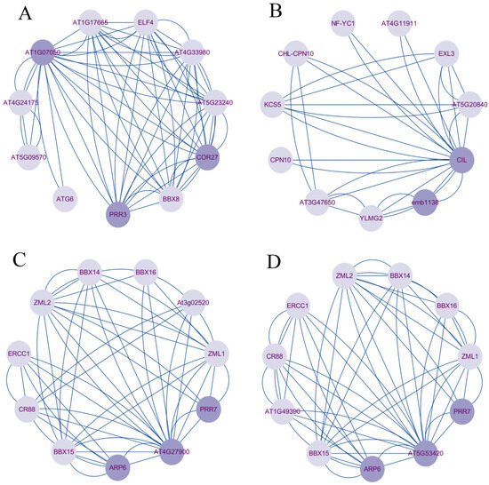 The PPI networks of four A. thaliana homologous genes: (A) AtCMF3 (AT1G07050), (B) AtCMF9 (CIL), (C) AtCMF10 (AT4G27900), and (D) AtCMF13 (AT5G53420). At the network nodes, the circles represent proteins, dark purple circles represent homologous genes and proteins associated with abiotic stress, light purple circles represent other interacting proteins, and connecting lines indicate associations between proteins.