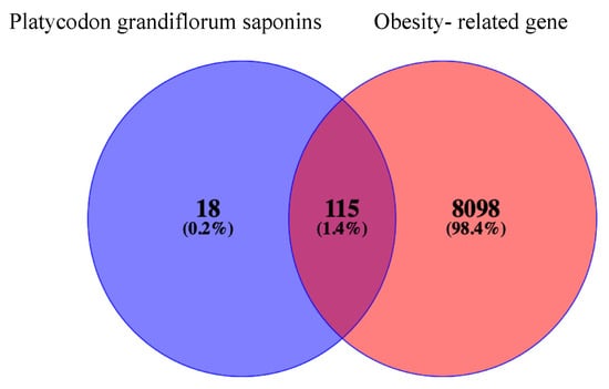 The intersection between obesity-related targets and active saponins in PG was identified through using the Venny 2.1.0 online system. The results of this analysis are shown in Figure 2. A total of 115 saponin targets were identified as intersecting with obesity disease genes [34].