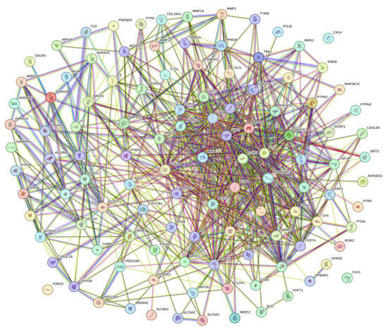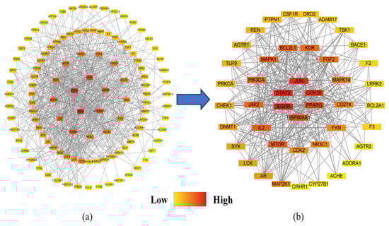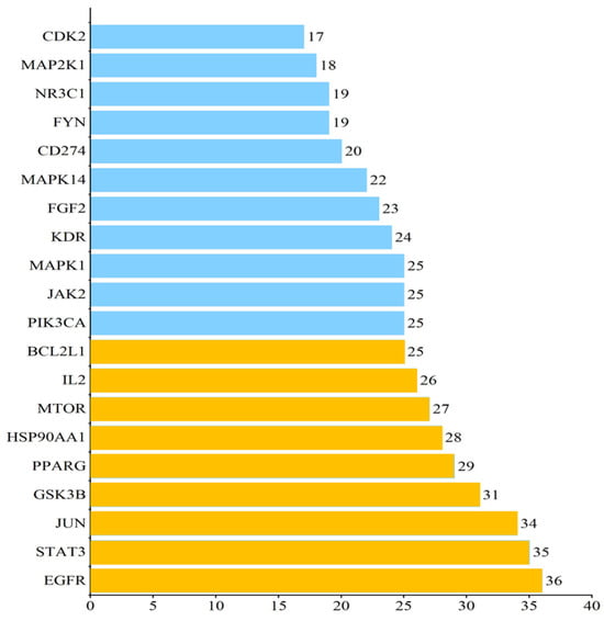 Imported into the Search Tool for the Retrieval of Interacting Genes/Proteins (STRING) database (https://string-db.org/, accessed on 12 August 2023) were potential targets, with choosing the target species to “Homo sapiens”. PPIs in the targets were examined, and the results were formatted in degree values. The data were formatted and then imported into Cytoscape 3.7.1 (https://cytoscape.org/, accessed on 12 August 2023) for presentation and processing, and then the “Network Analyzer” analyzed the PPI network.