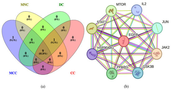The results of the PPI analyses of the PG saponins before and after screening for potential targets for obesity were exported as simple text data format files and then imported into Cytoscape 3.9.0 software to establish the PPI network shown in Figure 6a,b, Figure 6a is sorting of 115 targets and Figure 6b is sorting of the filtered 44 targets. To describe this network graph, the nodes are represented by colored circles, with each color indicating its degree from the lowest (yellow) to the highest (red). Meanwhile, nine anti-obesity central targets, i.e., EGFR, ESK3B, PPARG, HSP90AA1, STAT3, MTOR, IL2, JUN, and JAK2 were screened using MNC, MCC, DC, and CC in the CytoHubba network tool (Figure 7a), and these central targets are selected for molecular docking later [36]. The screened structures and the PPI network analysis of the nine anti-obesity central targets are shown in Figure 7b.