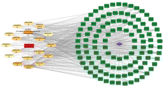 The Drug–Compounds–Targets–Disease network shows that each of the saponins in PG can interact with multiple targets, while several sides of the PG saponins can relevantly interact with a single target. This result demonstrates that the saponins are quite complex in PG interacting with multiple core anti-obesity targets [37]. Interactions between 18 active saponins from PG and 44 anti-obesity targets from obesity were explained.