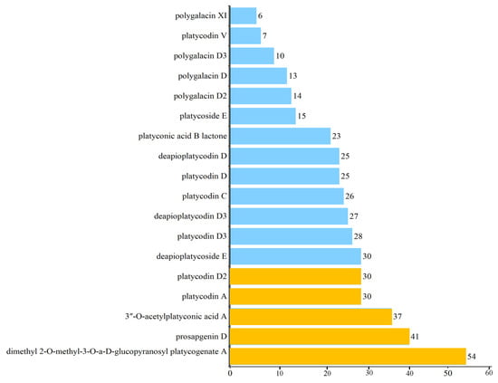 Active saponins from PG ranked by degree. The yellow bars stand for PG saponins with DC value greater than or equal to 30, which is used for molecular docking. The blue bars stand for PG saponins with DC value less than or equal to 30.
