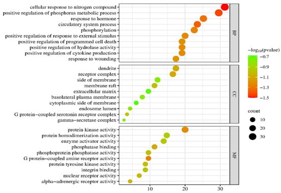 The GO enrichment analysis was performed on previously derived 44 anti-obesity core targets. Figure 10 shows the top 10 enrichment terms for each of the 44 anti-obesity core targets: BP, CC, and MF. The GO enrichment analysis results indicated that anti-obesity targets of PG saponins were involved in various biological processes.