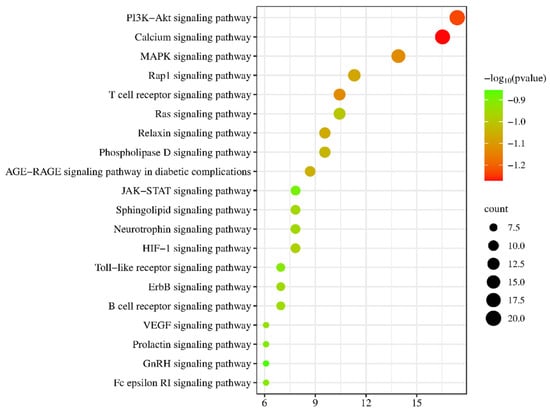 KEGG signaling pathways were expressed to infer the molecular mechanism of anti-obesity of active saponin components in PG, which was necessary. As shown in the figure, after uploading 44 PG anti-obesity core targets to the Metascape, the top 20 KEGG signaling pathways were listed in Figure 11. The KEGG signaling pathway enrichment analysis listed that the top three signaling pathways in KEGG molecules are the PI3K-Akt signaling pathway, the Calcium signaling pathway, and the MAPK signaling pathway. PG saponins mainly regulate these three signaling pathways to anti-obesity targets. PG’s active saponins may impact obesity’s molecular mechanism [38].