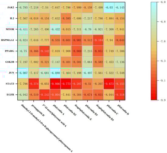 The results of molecular docking expressed that the binding affinities of the PG active saponins and anti-obesity-related proteins selected for this study were all lower than −6.0, indicating that all the saponins and anti-obesity-related targets can be bound to fight against obesity [60]. This study chose to demonstrate the binding of dimethyl 2-O-methyl-3-O-a-D-glucopyranosyl platycogenate A and IL2, prosapogenin D and STAT3, 3″-O-acetylplatyconic acid A and PPARG, platycodin A and EGFR, platycodin D2 and HSP90AA1, deapioplatycoside E and GSK3B, platycodin D3 and JAK2, deapio-platycodin D3 and JUN, platycodin C and MTOR, and platycodin D and EGFR in the 3D and 2D results of the ten pairings containing all selected saponins and central anti-obesity targets to illustrate the rationale for this study.