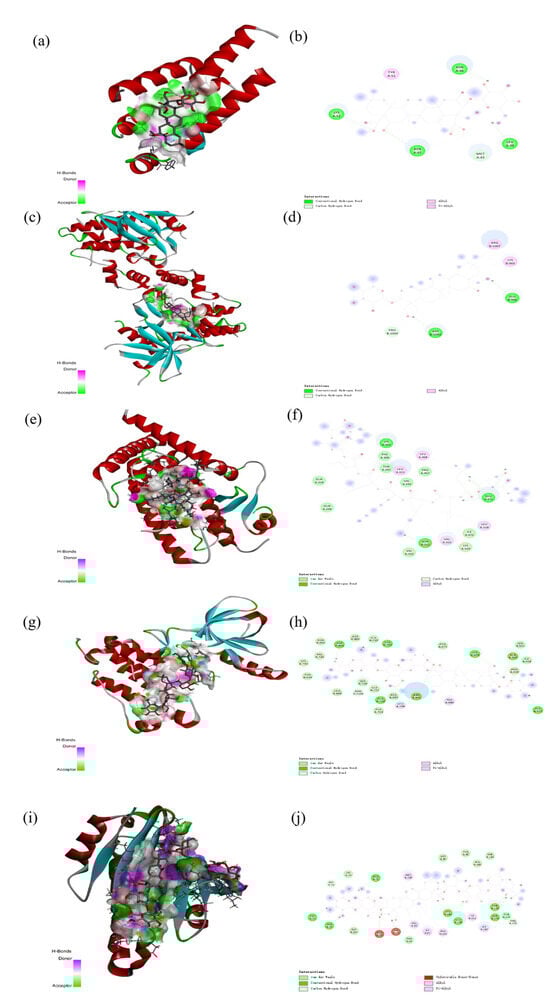 The 3D (a) and 2D (b) structures of molecular docking between deapioplatycoside E and GSK3B. The 3D (c) and 2D (d) structures of molecular docking between platycodin D3 and JAK2. The 3D (e) and 2D (f) structures of molecular docking between deapioplatycodin D3 and JUN. The 3D (g) and 2D (h) structures of molecular docking between platycodin C and MTOR. The 3D (i) and 2D (j) structures of molecular docking between platycodin D and EGFR.