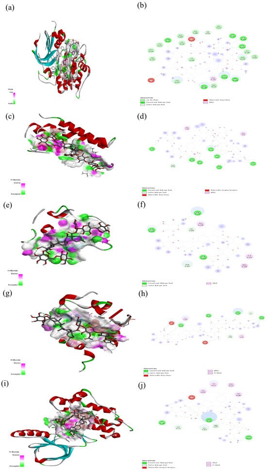 The 3D (a) and 2D (b) structures of molecular docking between dimethyl 2-O-methyl-3-O-a-D-glucopyranosyl platycogenate A and IL2. The 3D (c) and 2D (d) structures of molecular docking between prosapgenin D and STAT3. The 3D (e) and 2D (f) structures of molecular docking between 3″-O-acetylplatyconic acid A and PPARG. The 3D (g) and 2D (h) structures of molecular docking between platycodin A and EGFR. The 3D (i) and 2D (j) structures of molecular docking between platycodin D2 and HSP90AA1.