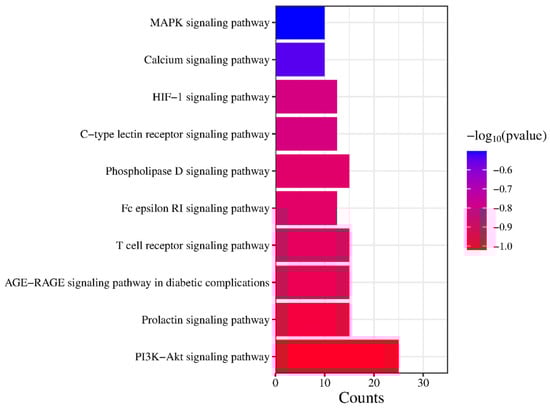 As with the purpose of the KEGG analysis described above, the KEGG analysis of prosapogenin D allowed a more detailed inference of the molecular mechanisms of the anti-obesity effects of PG. The anti-obesity targets of prosapogenin D were sent to the DAVID tool, which showed the ranking top ten KEGG pathways of prosapogenin D; the KEGG signaling pathway enrichment results demonstrated that similar to the results of all active saponins in PG, anti-obesity targets of prosapogenin D were mainly included PI3K-Akt signaling pathway, while Calcium and MAPK signaling pathway also appeared in the KEGG analysis results of prosapogenin D (Figure 15), which also proved that PG saponin prosapogenin D played an anti-obesity role, validating the plausibility of the experiment. These signaling pathways may play a part in treating obesity by the molecular mechanism underlying Prosaponinogen D. Prosapogenin D was also selected for molecular docking with regulatory proteins in the PI3K-Akt signaling pathway to provide more in-depth research in this study.