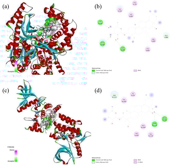 The 3D (a) and 2D (b) structures of molecular docking between prosapogenin D and PI3K. The 3D (c) and 2D (d) structures of molecular docking between prosapogenin D and Akt.
