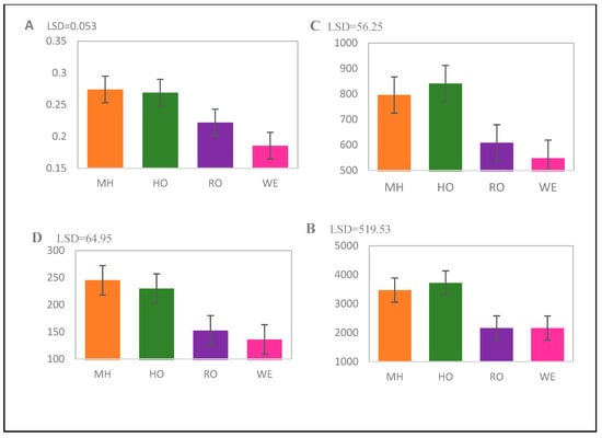 (A) ascorbic, (B) phenolic, (C) flavonoid, and (D) tannin contents of A. afra genotypes from four geolocations: Lesotho (Mohale’s Hoek (MH): 30.1426° S, 27.4674° E, and Roma (RO): 29.5212° S, 27.7755° E) and South Africa (Wepener (WE): 29.7294° S, 27.0206° E, and Hobhouse (HP): 29.5258° S, 27.1452° E).