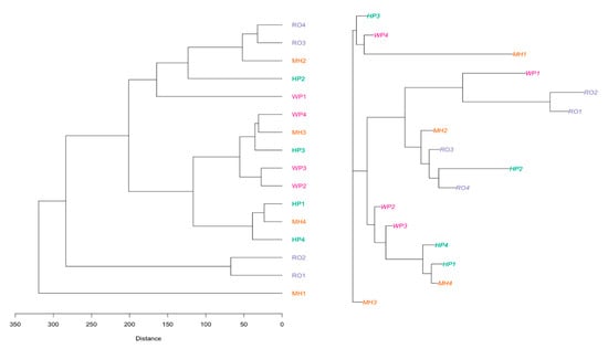 Foliar mineral relationships between populations of A. afra using unweighted pair group method with arithmetic mean and neighbor-joining method. Lesotho (Mohale’s Hoek (MH): 30.1426° S, 27.4674° E, and Roma (RO): 29.5212° S, 27.7755° E) and South Africa (Wepener (WE): 29.7294° S, 27.0206° E, and Hobhouse (HP): 29.5258° S, 27.1452° E).