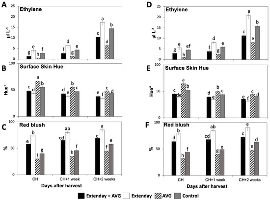 In this study, strong and consistent differences were observed in the internal ethylene concentration (IEC) and red skin coloration amongst the different Extenday and AVG treatment combinations for the two evaluated production seasons (Figure 1).