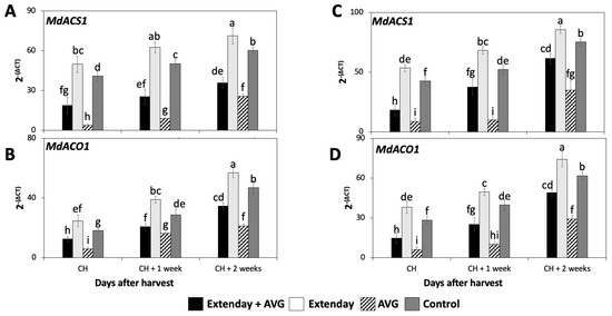 Effects of Extenday and AVG combinations on the relative gene expression levels of ethylene biosynthetic genes of ‘Honeycrisp’ fruit grown in Aspers, PA, in (A,B) 2021 and (C,D) 2022. Apples were evaluated at the optimal commercial harvest (CH), 1 week after CH (CH + 1), and 2 weeks after CH (CH + 2). Values are means ± standard error. Different letters indicate significant differences (p ≤ 0.05) according to Tukey’s HSD test; 1-aminocyclopropane-carboxylase synthase (ACS), 1-aminocyclopropane-carboxylase oxidase (ACO).