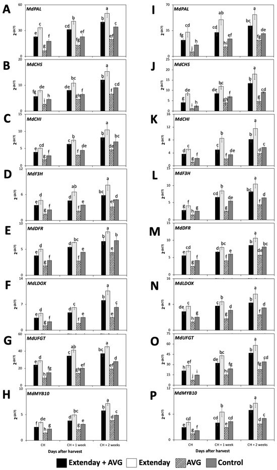 Effects of Extenday and AVG combinations on the relative gene expression levels of anthocyanin structural biosynthetic genes and MdMYB10 of ‘Honeycrisp’ fruit grown in Aspers, PA, in (A–H) 2021 and (I–P) 2022. Apples were evaluated at the optimal commercial harvest (CH), 1 week after CH (CH + 1), and 2 weeks after CH (CH + 2). Values are means ± standard error. Different letters indicate significant differences (p ≤ 0.05) according to Tukey’s HSD test. Phenylalanine ammonia-lyase (PAL), chalcone synthase (CHS), chalcone isomerase (CHI), flavanone 3-hydroxylase (F3H), dihydroflavonol 4-reductase (DFR), leucoanthocyanidin dioxygenase (LDOX), UDP glucose-flavonoid 3-O-glucosyltransferase (UFGT).