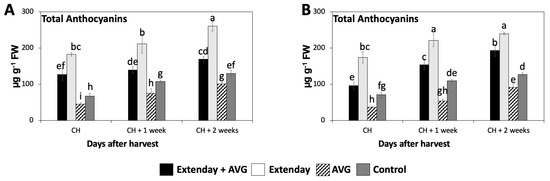 The total anthocyanin concentration significantly increased throughout the three assayed ripening stages in this study, resulting in a 1.4- to 2.5-fold increase from CH to CH + 2, considering all the treatment combinations in both years (Figure 4). At all evaluation periods, the Extenday-only (T2)-treated fruit always displayed the significantly highest concentration of total anthocyanins (ranging between 170 and 270 µg g−1), followed by the combined Extenday + AVG (T1) treatment (ranging between 100 and 200 µg g−1), and next by the control (T4)-treated fruit (ranging between 70 and 130 µg g−1), while the AVG-only (T3)-treated fruit presented the significantly lowest values (ranging between 40 and 100 µg g−1) consistently in both assayed years (Figure 4).