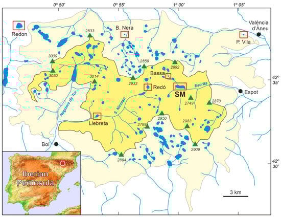 Sketch map of the Pyrenean “Aigüestortes i Estany de Sant Maurici” National Park (PNAESM) and its location in the Iberian Peninsula (red dot). The park itself is in yellow and the peripheral protection zone is in light yellow. Green triangles represent the highest peaks (elevations in m), and lakes and rivers are in blue. The localities (lakes, peat bogs) with Lateglacial/Holocene pollen records are highlighted by red boxes (SM, Lake Sant Maurici). Redrawn and modified from Ref. [].
