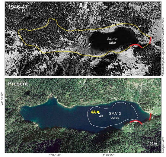 Lake Sant Maurici before and after damming (1953 CE). The upper panel shows the former glacial lake and the contour of the present reservoir (yellow line), whereas the lower panel displays the present reservoir and the contour of the former lake (white line). Damming areas are indicated by red lines. The core used in this study (SMA13-4A) is highlighted in yellow and the core studied by Calero et al. [] and Rull et al. [] (SMA13-4B) is indicated in white. See Ref. [] for more details.
